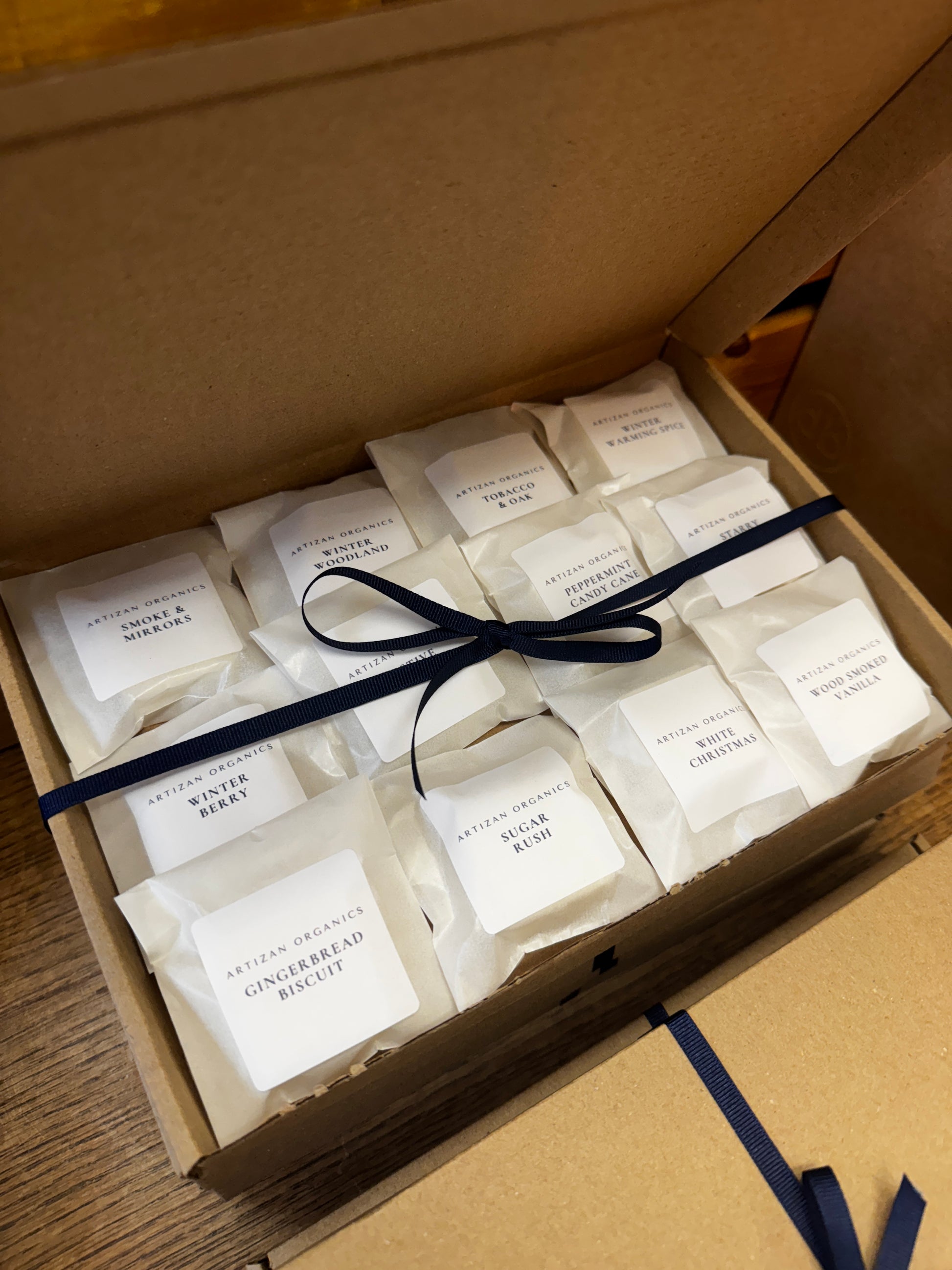 Discover 12 unique, hand-poured soy wax melts, each individually wrapped and labelled, in a beautifully curated mix from our full fragrance range.