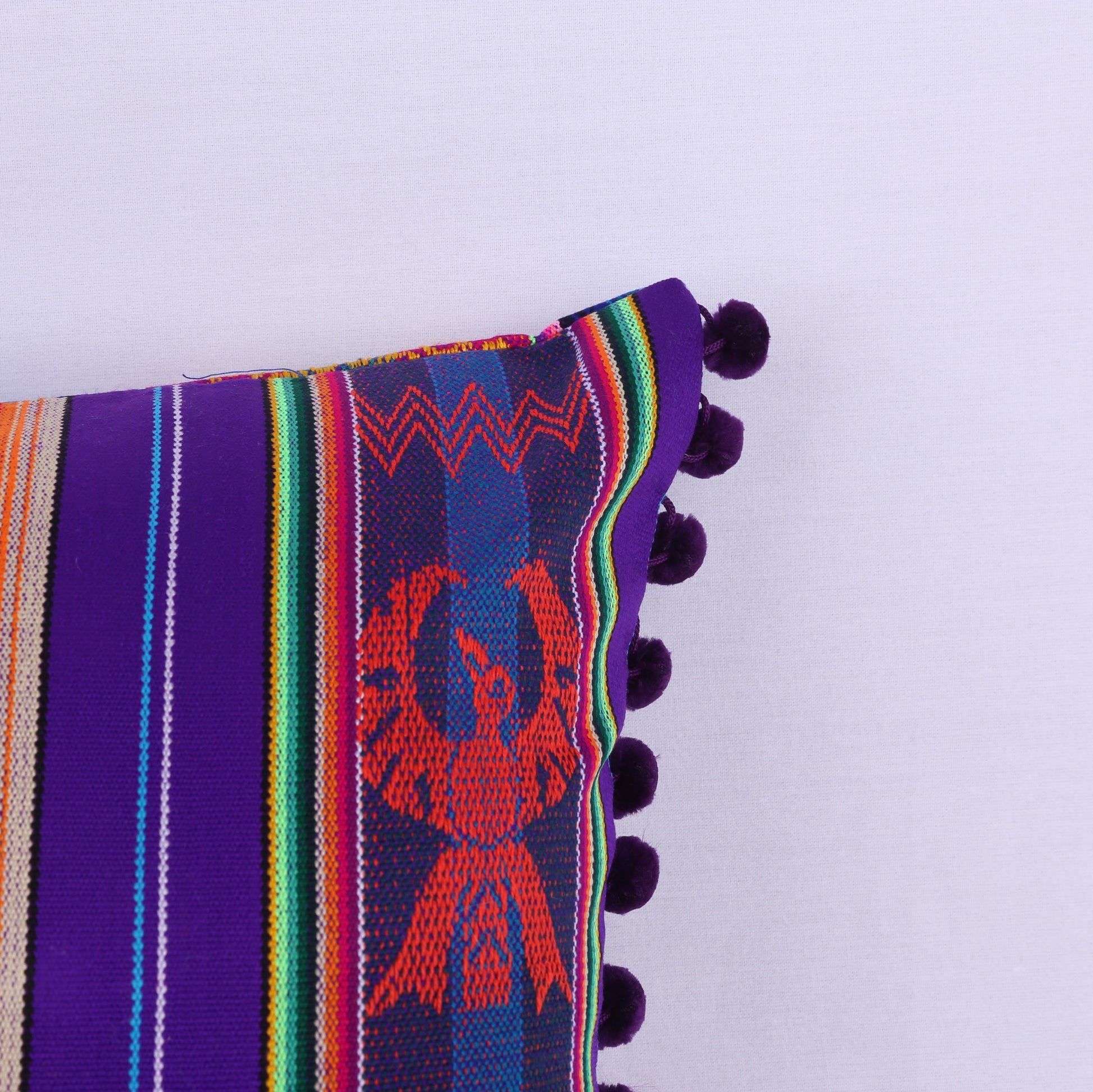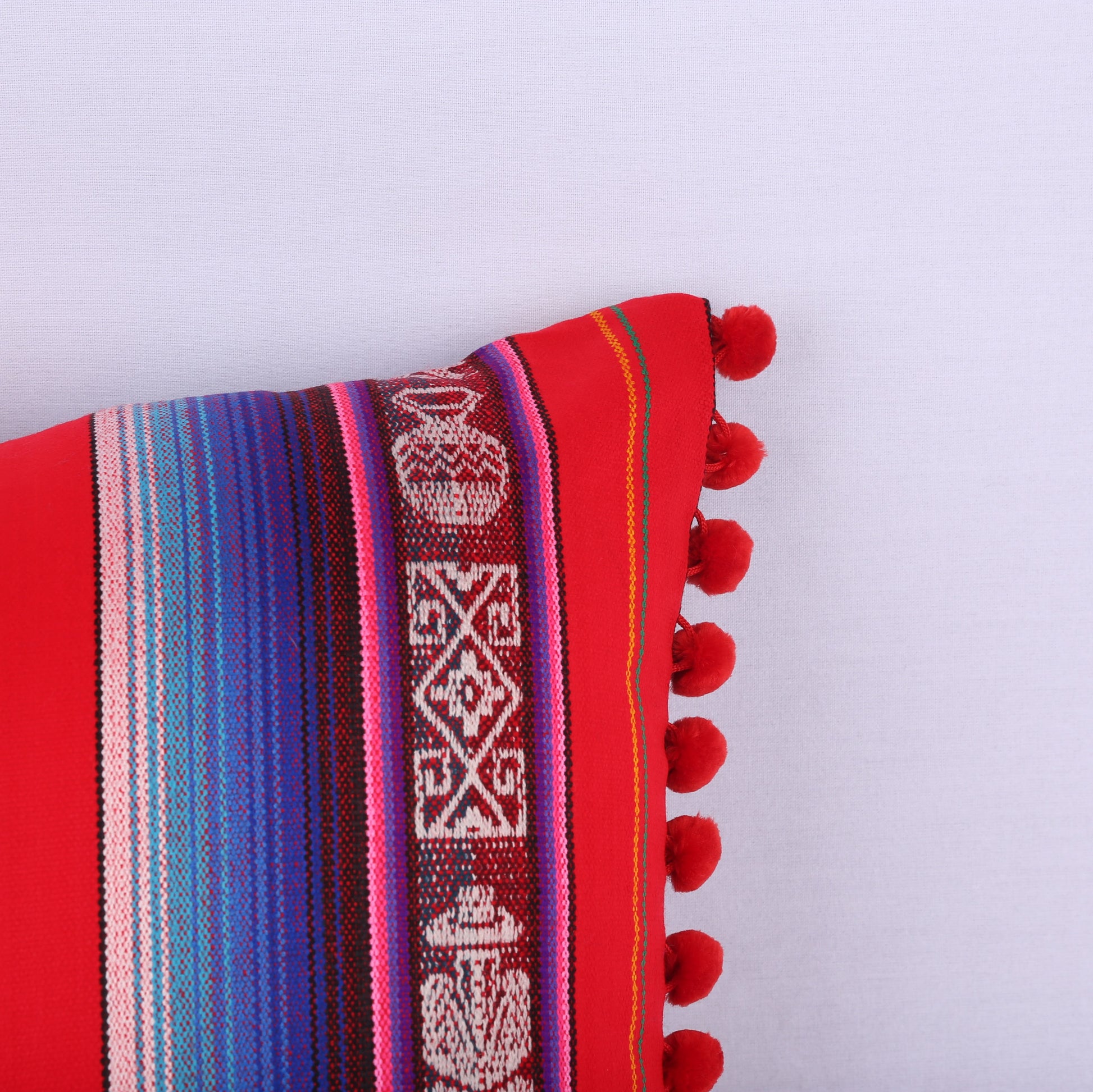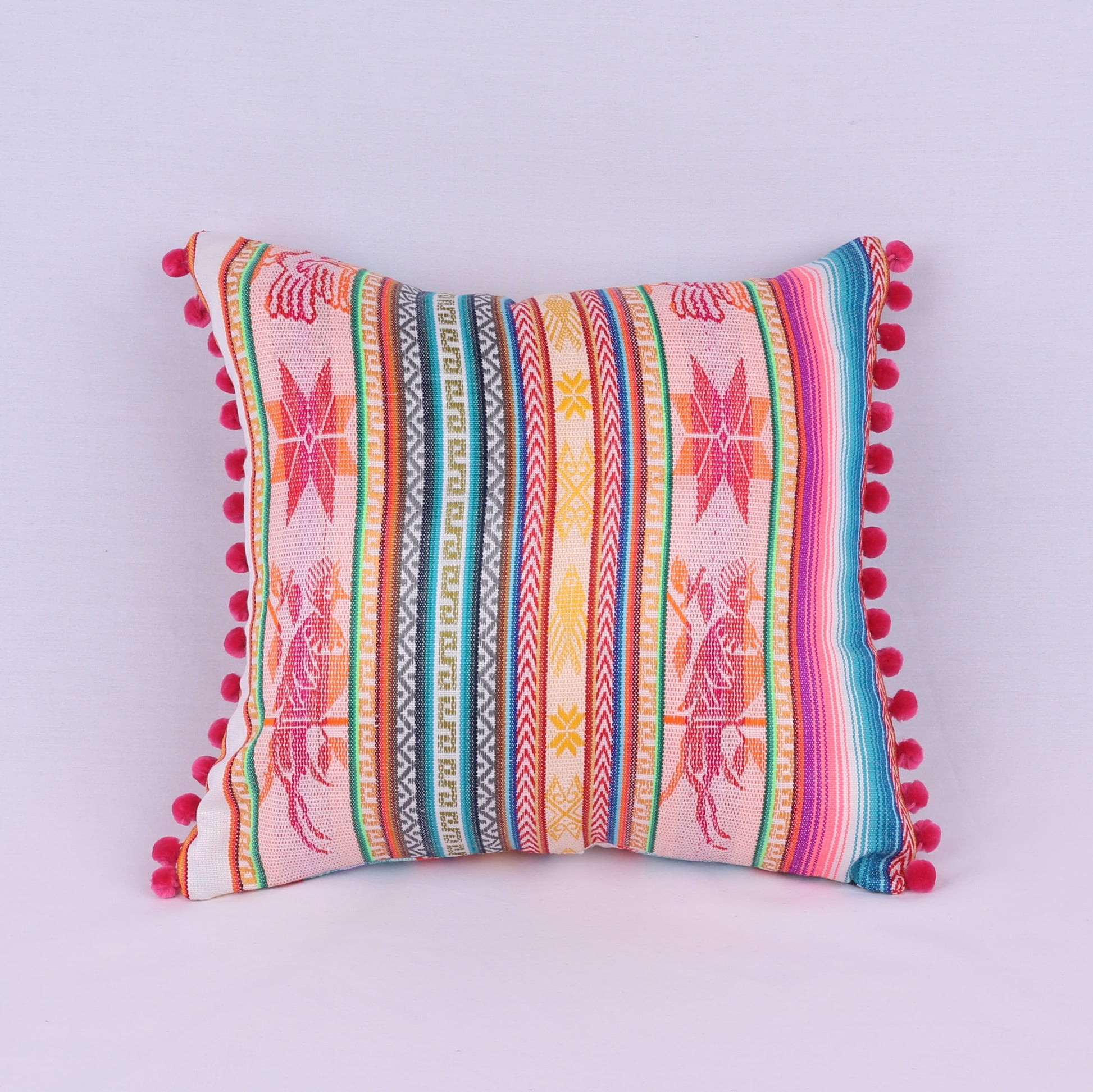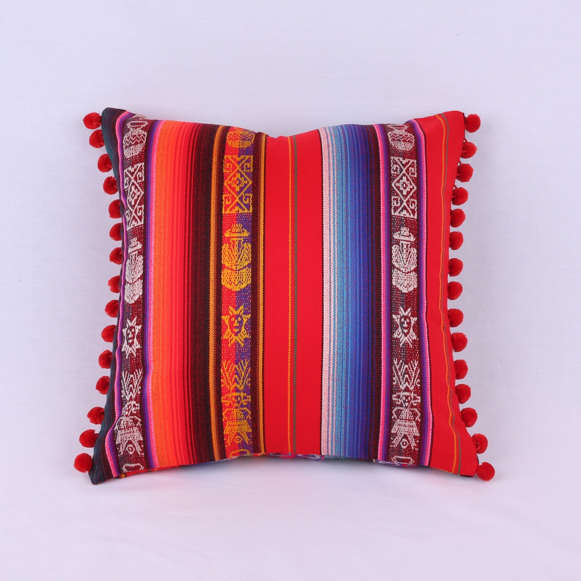 Handmade in Ecuador by Frixon, these vibrant cushions feature traditional Ecuadorian fabric finished with cheerful pompoms sewn on by volunteers in Harrogate, North Yorkshire. A discreet back zip allows for easy removal of the insert.
